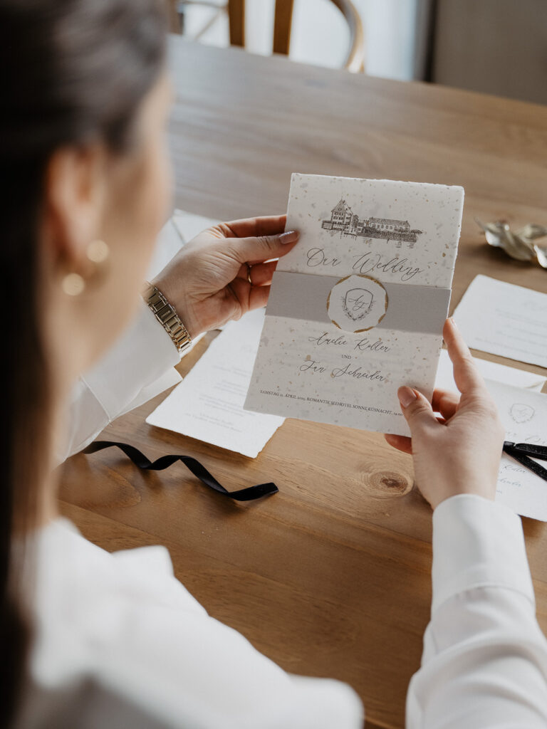 Zweiter Fehler: Die Veredelungstechniken werden nicht eingeplant. Letterpress benötigt 4 bis 6 Wochen Vorlauf, Heißfolienprägung 3 bis 5 Wochen. Bei handgefertigten Elementen oder handgeschöpftem Papier kommen weitere 2 bis 4 Wochen hinzu. Eine vorausschauende Hochzeitsplanung berücksichtigt diese Produktionszeiten von Anfang an.